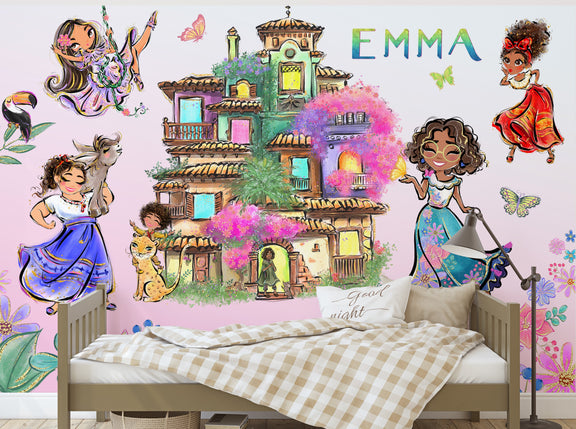 Introducing our enchanting full wall mural featuring the captivating Encanto Disney theme. This vibrant mural showcases the stunning "Casa Madrigal" as its centerpiece, surrounded by a burst of vivid colours. Immerse yourself in the world of Encanto as you admire the remarkable sisters - Mirabel, the spirited and determined protagonist, Luisa with her strength and resilience, Isabela radiating beauty, and Dolores, whose charm is undeniable.