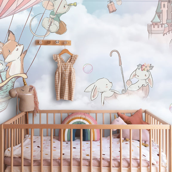 The overall effect of this wallpaper is cheerful and dreamlike, creating a whimsical atmosphere in any space it adorns.