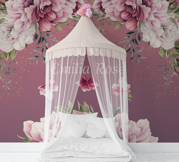 Peonies and Roses wallpaper featuring large, soft pink flowers is the perfect addition to a nursery, girls room or a bedroom. Soft watercolour flowers add the gentle touch and give a calming and warm feeling.