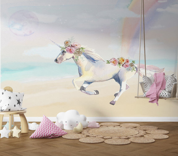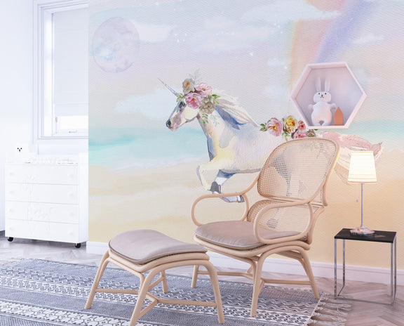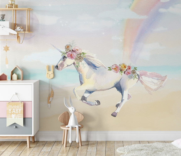 Beautiful and gentle unicorn and rainbow wall mural featuring soft pastel watercolour flowers and castle is the perfect addition to a baby/ girl's bedroom. Soft watercolour colours add the gentle touch and give a calming and warm feeling.